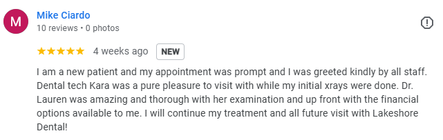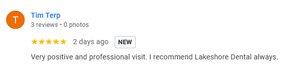 Watch video testimonials from two of our patients and read the online reviews of others to see what they have to say about their experience at Lakeshore Dental. Want to share your experience? Leave us a review on Google or Facebook and let us know what you think.